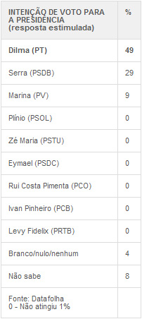 De acordo com o Datafolha, num eventual segundo turno entre Dilma e Serra, a petista teria 55% e o tucano, 36%. Na pesquisa anterior, Dilma tinha 53% das intenções de voto, e Serra, 39%.